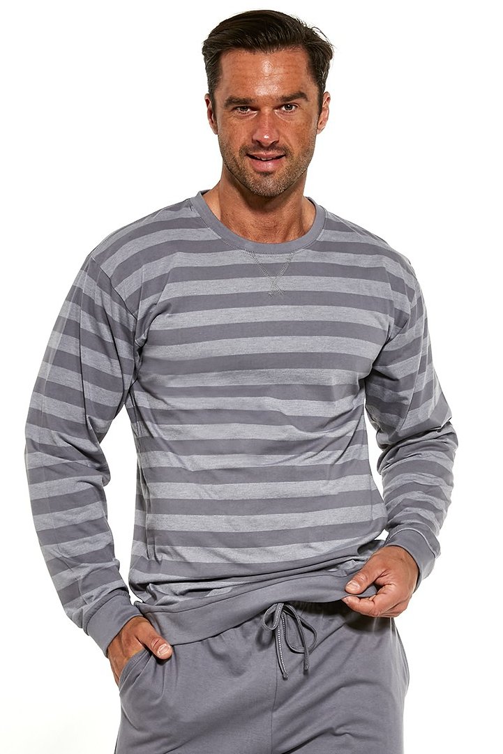 Pánské pyžamo s elastickými manžetami na rukávech i nohavicích. Univerzální šedý odstín padne do oka každému muži. Triko zdobí pruhovaný vzor, kalhoty jsou jednobarevné, bez vzoru. Po stranách jsou umístěné kapsy, pas je elastický a rovněž doplněn šňůrkou pro lepší regulaci. V tomto ležérním kousku nemusíte chodit jenom spát, využijte jej i jako univerzální homewear. Tento kousek se hodí i jako atraktivní dárek, je totiž balený do hezké krabičky.