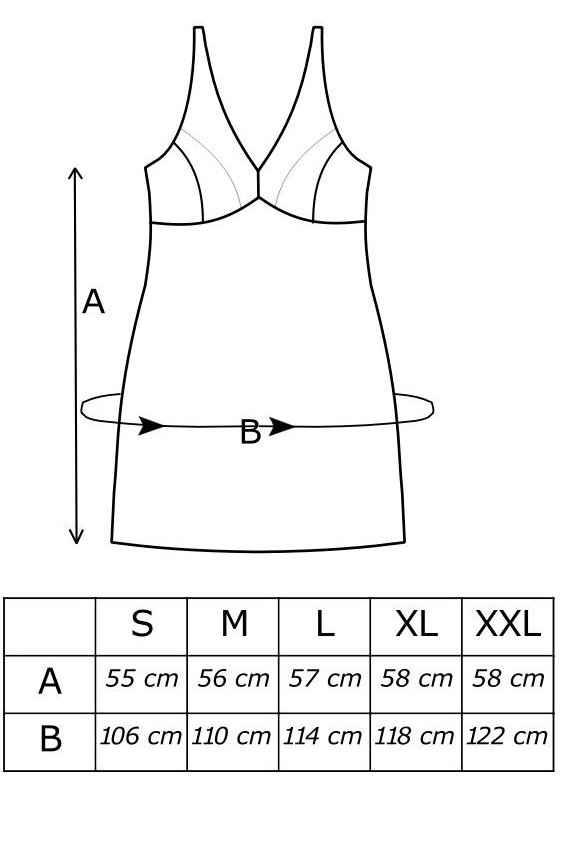 Ramínka jsou v přední části široká, krajková. Na zádech jsou tenká, lze je snadno regulovat a košilku si tak přesně přizpůsobit dle svých preferencí. Délka zasahuje do poloviny stehen, nechá tak vyniknout smyslné ženské linie.