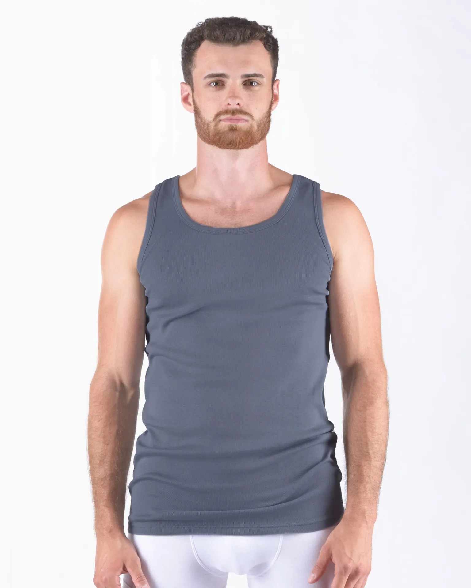 Tílko se širšími ramínky z žebrového úpletu. Jedná se o pánské šité prádlo. Průramky a průkrčník jsou začištěny lemovacími proužky. Nátělník je jednobarevný. Použitý jemný žebrový úplet je pružný a velmi příjemný na nošení.