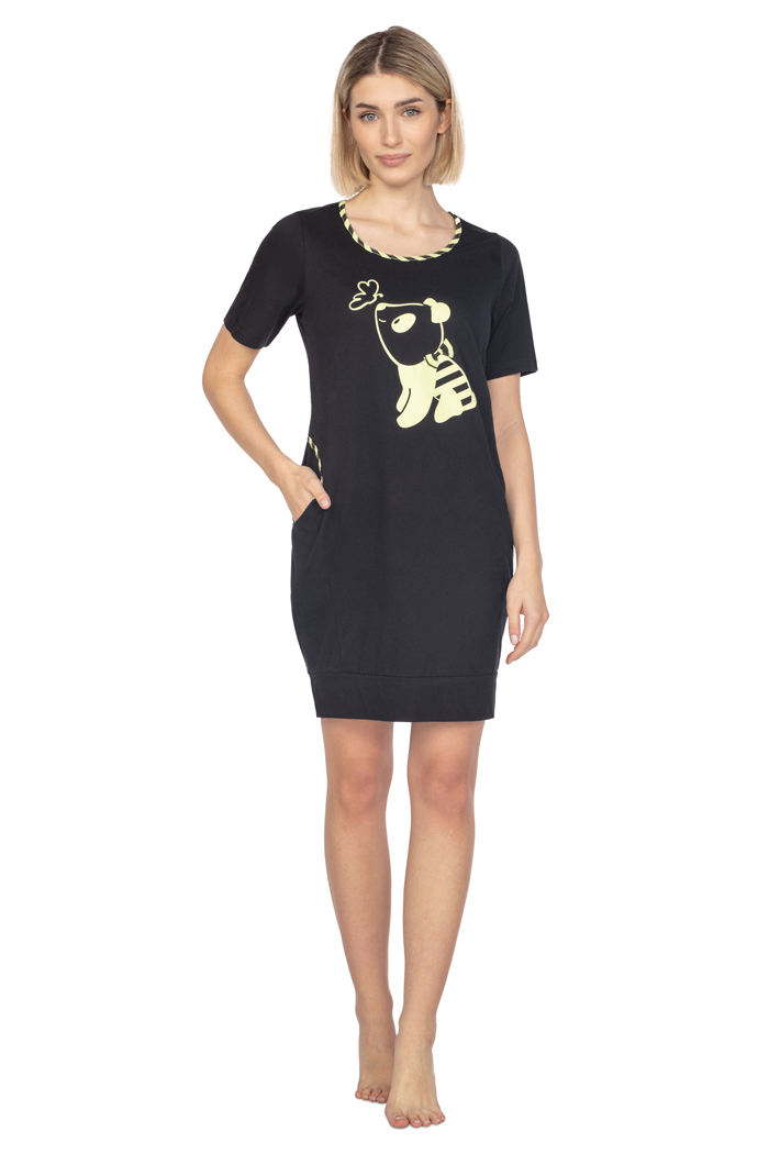 Dámská noční košile s krátkým rukávem. Výstřih do kulata je olemován proužkovým lemem. Na přední straně roztomilý obrázek. Dvě boční kapsy, které jsou olemovány proužkovým lemem. Košile je ve spodní části zakončená lemem. Délka nad kolena. Možné nosit i jako domácí šaty. Kvalitní bavlněný materiál.